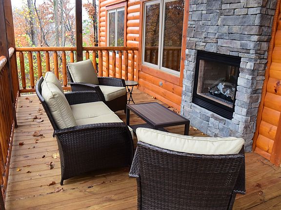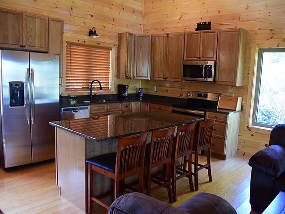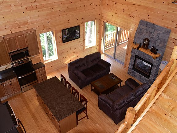 "Happy Bear's Hideaway" was rebuilt following the November, 2016 wildfire. Originally a single story, one bedroom/one bath cabin, it was rebuilt as a two story plus loft.