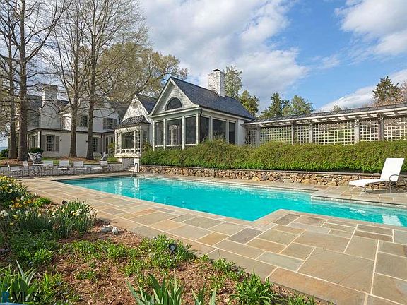 Perched on an 8 acre landscaped island in the middle of the renowned Farmington Golf Course, Appletree House is an extraordinary residence with mountain views and great privacy , yet close to everything Charlottesville has to offer. The original 1939 classic brick Virginia Manor ,has been renovated and restored with major additions designed by Jay Dalgliesh, including a wonderful gourmet kitchen / Great Room , a spacious first floor master suite and office, and a separate, beautifully done pool house/ guest quarters complex with a 4 bay garage . Other amenities include a wine cellar and tasting room, screen porch with built in gas grill & FP overlooking an herb garden, fire pit entertainment area, exercise room, nanny quarters and more.