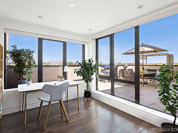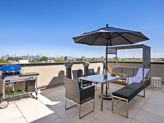 Penthouse unit with expansive private terrace with Manhattan views and parking in building (2 available spots). Available immediately! Ask about our different deals for longer term leases Don't miss your chance to experience this extraordinary penthouse, great for a starter or an investment. PHC is a rare gem, featuring a large private terrace with city views, 1-bedroom, 1-bathroom, 1 assigned parking spot in the building garage and an office nook that looks out onto the terrace. This layout encompasses approximately 1,041 square feet of thoughtfully designed interiors. Step inside and be greeted by a stylish and open kitchen, boasting Lagos Quartz countertops, custom double square cabinetry, and top-of-the-line Fisher & Paykel and Bosch stainless steel appliances. The kitchen's centerpiece is an inviting island, perfect for seating 2-3 bar stools. The bathroom is adorned with Flash Bisel Blanco wall tiles, fashionable Cementine black and white flooring, and Aquabrass fixtures. A Benoist reclaimed wood vanity and a deep soaking Duravit bathtub complete this bathroom. Additional features of this remarkable penthouse include a separate dining area or home office, central heat/air, recessed lighting, white oak hardwood floors, Unitone video intercoms, large windows that flood the space with natural light, and the convenience of an in-unit Bosch washer/dryer. 1255 Bushwick Avenue offers a range of enticing building amenities like a package room, bike storage for added convenience, and a terrace providing an inviting outdoor space to relax and enjoy. 1 additional parking spot in the building's garage can be negotiated along with this purchase. Transfer taxes will be paid by the seller. Located in the heart of Bushwick, this prime location immerses you in an unparalleled vibrant art scene, fabulous restaurants, and exciting nightlife. Just one block away to the JZ trains at Halsey Street or a short walk to the L train at Wilson Avenue, offering a quick commute into Manhattan and connecting you to the endless possibilities of the city. Please No Pets.