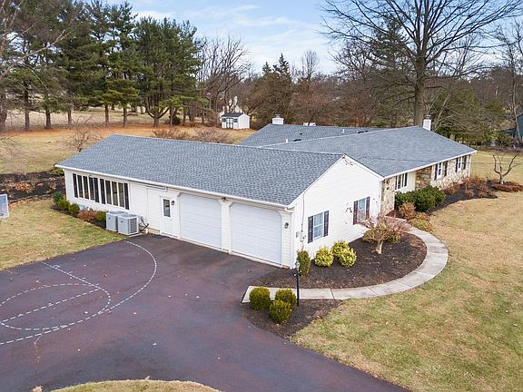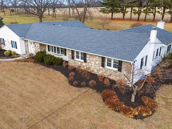Beautiful stone front ranch home with over 4,000 square feet of living space on 1.4 acres backing to open farmland. Newly remodeled kitchen (2023) with custom white cabinets, stylish quartz countertop and backsplash, newer appliances including an induction range, luxury vinyl plank flooring, under cabinet lighting and walk-in pantry that could serve as a butler’s pantry. The kitchen is open to a large breakfast area with the same plank flooring, vaulted wood plank ceiling, two skylights, track lighting, a wall of windows and glass door to a paver patio, all overlooking a peaceful, serene and very private rear yard with pretty garden beds. The adjacent great room boasts a vaulted shiplap ceiling, multiple fixed windows and open steps to a finished basement. The formal living room offers a bow window and opens to the adjacent dining room with wall scones, chair rail and French glass doors to the breakfast area. The family room at the back of the home has another bow window and a raised hearth fireplace with a Minolta gas insert and brick surround. The owner’s bedroom has a walk-in closet with organizers, a 2nd closet and a nicely updated full bath with walk-in shower with tile surround and seamless glass doors, dual vanity with quartz counters and built-in cherry cabinets. The other two bedrooms in the original wing of the home are serviced by an updated hall bath with laundry. The 4th bedroom is adjacent to the family room and utilizes a full bath off the breakfast area. The finished basement area offers two rooms each with tile flooring and walk-in closets. The original basement area is unfinished and offers tremendous storage and potential uses. Oversized two-car garage (28x24) and shed offer additional storage. *** New Yorker boiler with 6 zones *** 2 Carrier Central AC units (2022) *** New Roof (2021) *** Public Sewer (connected in 2021) *** New Well tank (2023) *** Clean neutral decor, great natural light, and a ton of room to spread out. Meticulous attention has been given to maintenance, updates and energy efficiency. Great location on a quiet street in Towamencin Township with easy access to schools, shopping, commuter routes, parks and recreation.