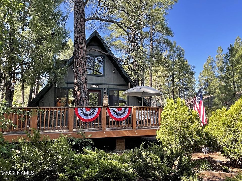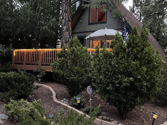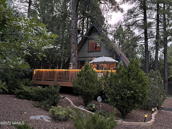 Beautiful A Frame located in one of the most desirable locations in Munds Park. Quiet street and close to the National Forest. Lot is surrounded with Aspen, Oak, Apple and Pine Trees. Level lot with lots of parking space. Fenced in back yard, work shed and large deck off the back of the home. The main floor of the cabin has living room, kitchen, full bath and bedroom. Upstairs is a cozy dormer loft with day bed and desk area. An additional room with its own bath and closet. Can't call it a bedroom (only missing a door). Earthstove located in the living room will keep you warm during those winter nights. Upgraded kitchen with full sized washer and dryer. Newer appliances. Home is being Sold furnished. You won't be disappointed with this cabin.