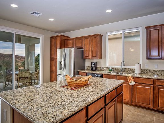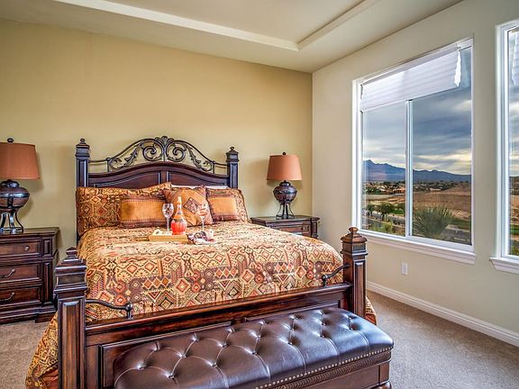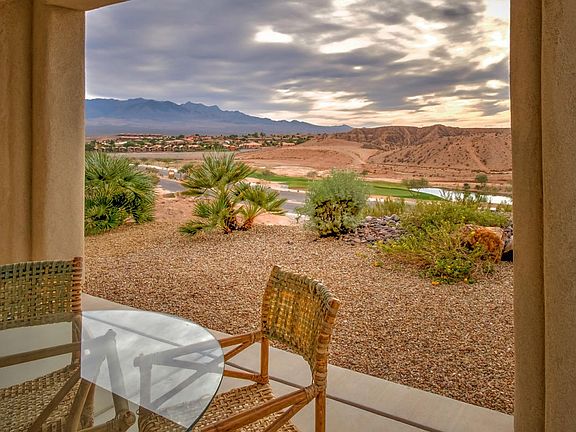 GREAT VIEWS! This home is located on a bluff overlooking Oasis Canyons Golf Course and the City of Mesquite! Home is a 2 Bedroom with a Den and 2 Bathroom. Garage is 2+ Car with 572sq.ft. Home has many upgrades. Starting in the Kitchen; Granite Counter Tops, staggered Cherry Cabinets, Built in Cook-top stove, Built in Oven and Microwave. All Built in Appliance are Stainless Steel. Refrigerator also included. Home has upgraded Tile Flooring in Entry, Kitchen, Dining and Bathrooms and Carpet in Bedrooms and Great Room. Master Bedroom has views looking over Mesquite. Master Bathroom has Garden Tub and Shower. Granite Counters in Master Bathroom with Dual Vanity and Walk-in Closet. Yard is fully landscaped with drip system irrigation system. Home has had very little use since it was built.