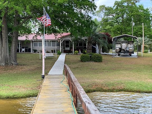 WATERFRONT LIVING in a very desirable neighborhood ON WHITE OAK/WYBOO featuring deep water, dock, sandy beach, beautiful manicured yard with palm trees and concrete driveway. an insulated garage for golf cart, lawn mower, fishing equipment, tools and lake toys, also, a metal shed for the pontoon. House includes master suite with double sinks in bathroom and 3 bedrooms, 2 and a half baths., open floor plan including a sun room with a beautiful view of the lake. Enjoy an early morning cup of coffee or late afternoon glass of tea under the covered porch or dock over the water. Looking to play a little golf there are 2 golf courses within 3 miles. If you are looking for a place at the lake, THIS IS IT. Furniture to convey.