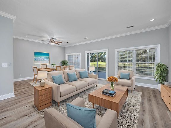 This stunning 3-bedroom, 2-bath brick home offers a picturesque setting overlooking the 17th green of the Prestwick Country Club golf course. Featuring a spacious custom kitchen with granite countertops, work island with cooktop, pull out shelving in cabinets, stainless steel appliances, and a breakfast bar, the home is perfect for entertaining. The spacious family room boasts large windows with breathtaking golf course views! The expansive owner's suite includes a tray ceiling, ceiling fan, and dual walk-in closets. The updated ensuite bath includes a tile walk-in shower, dual sinks, and space for a sauna or tanning bed. Enjoy the convenience of a flex room or home office located just off the entrance of the home. Recent updates include new luxury vinyl plank flooring, fixtures, and ceiling fans. Enjoy the outdoors from the 24x8 screened-in porch or the charming paved brick patio, set in a large fenced backyard with views of the lush golf course. Located in the desirable Prestwick community, residents also enjoy access to a clubhouse, pool, tennis courts, and pickle-ball courts, all just a short drive from local beaches and attractions. Do not pass up your chance to own this beautiful home, call today to schedule your showing!