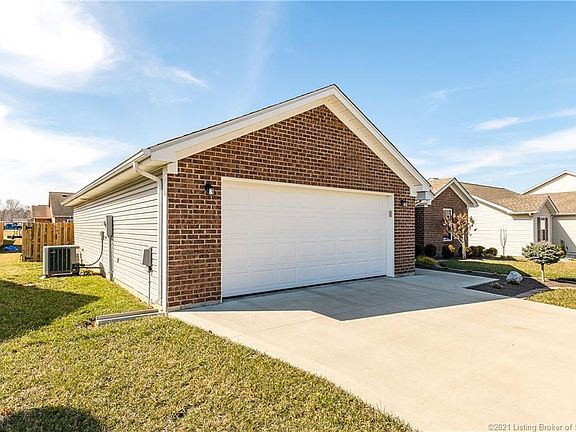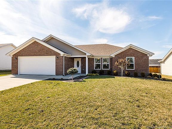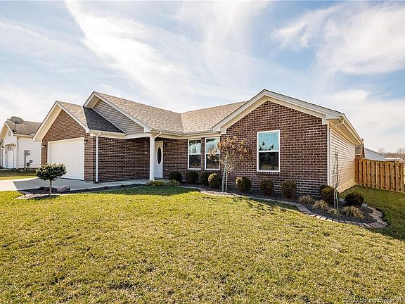 Show ready and DREAMY. This immaculate 3yr old home will appeal to so many buyers. Totally open floorplan offers a pretty kitchen w/ a moveable ISLAND plus PANTRY. Kitchen appliances remain with the home (fridge, d/w, m-wv, range). Split bedrooms, spacious owners suite which has an enormous closet. Nice laundry room (not just a laundry closet) has cabinetry. Luxury vinyl plank flooring throughout the main living area, bathrooms and laundry. You'll find tasteful landscape, fenced backyard and the storage shed stays. Convenient location with close proximity to interstate, shopping, dining and it's about 25-30min to Louisville. Out front (to the right) overlooks some greenspace w/ pond.