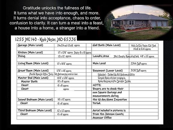 Spacious Living Welcomes You with Plenty of Natural Sunlight! Ranch style 2344 SqFt FINISHED & a 3-vehicle garage. Plus a FULL 3136 SqFt Walkout basement includes area under the garage floor for storm protection. This open floor plan is designed as a step-saver for large family gatherings and holidays. The kitchen is a chef’s delight with abundant custom wood cabinets with large island, plus separate eat-in breakfast bar, and stainless-like appliances. Also included is large adjoining pantry with upright freezer. A dining area overlooks a deck for views while dining to enjoy nature’s many birds and wildlife... #1 bedroom suite is complimented with a 6’x8’ walk-in closet, a well-equipped bath/shower combo, vanity and features many custom wood cabinets for storage. #2Bed has 6x6 closet and windows overlooking the backyard. #3Bedroom will prove to be perfect for any guest visiting your home and also includes 6x6 closet. Hallway is 4’ wide and solid interior wood doors 3’ wide. Hall Bath includes walk-in jetted tub, custom vanity, high rise stool. Comfortable & private study or #4 bedroom provides flexibility for options. Current Great Room has a separate outside entrance door with adjoining half bath to accommodate home office. The 3136 Sq Ft unfinished basement has 9' height walls, stub-up for #4 bathroom utility room. Concrete Storm Room. (2)200 amp breaker boxes sump pump. Other features River Rock propane gas fireplace, hardwood floors, window treatments, water softener outdoor living areas, decks, upper covered deck. Energy efficient upgrades include exterior walls (styrofoam, rebar, concrete), thermal TRIPLE PANE windows, garage doors, insulation in attic, heat pump unit ~ Sewer Lift Station with backflow preventer. The home was built in 2010. The 2022 Real Estate Taxes were $2154. Located outside city limits. High School Ranks in the top 3% of MO high schools. Rated #1 in the MO rural districts + other awards. One Year Home Warranty up to $600 is included.