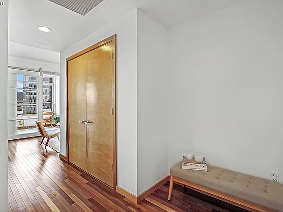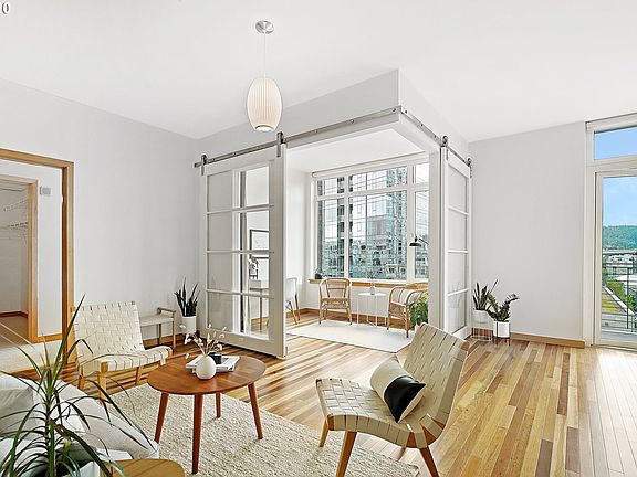 Stunning views from this beautiful corner unit! Natural light flows throughout this lovely 2 bedroom, each has walk-in closet & newer wool carpet. Bonus room w/ sliding glass doors is perfect for a home office or 3rd bedroom. Gorgeous reclaimed tropical hardwoods throughout, high ceilings and elegant fixtures. Private deck, stainless steel appliances, in unit laundry, AC, Nest thermostat, secured entrance, deeded parking & storage. Virtual Open House 7/11 12-12:30 on Instagram, @thinkportland.