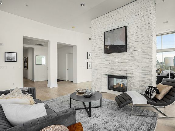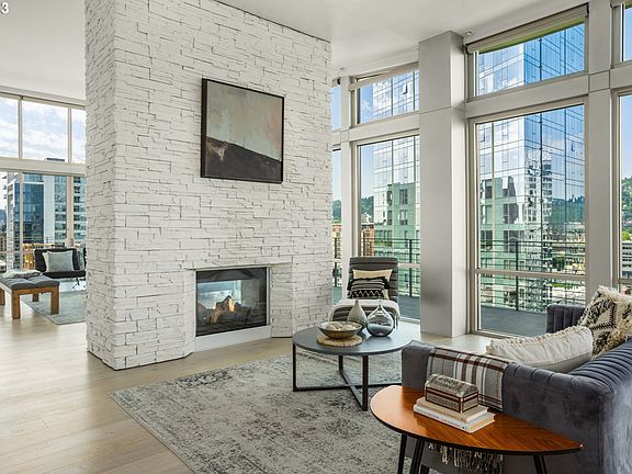 Sunrises, sunsets, bridges, river, mountains and city skyline views can all be enjoyed from the stunning space that is this sleek and sexy one level penthouse. The impressive living space is created by an immaculate interior which is bathed in natural light from its floor to ceiling windows throughout. Large entertainment spaces flawlessly flow between the expansive wrap around 1300 square feet of private patio accessible from every room and a chefs kitchen that has been meticulously remodeled and includes high-end appliances, quartz countertops, large center island, sleek cabinetry, ample recessed lighting and a gas range. Drift off to sleep each night in the spacious south facing main bedroom that offers two large walk-in closets and a city view centering on iconic Big Pink. Bright and private, the primary bathroom features a walk-in shower, oversized tub, double sinks, stone vanity and stone flooring. Two additional bedrooms make this penthouse property a unique opportunity to reside in and above one of Portlands premier neighborhoods.