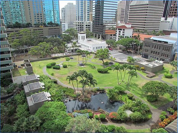 Available Now! New flooring! 2 Bedrooms, 1 Bath, 1 Assigned Covered Parking at Kukui Plaza. Right next to Downtown and HPU. Corner unit with garden view. Water, sewer and basic cable included in rent. Partly furnished with refrigerator, stove, in-unit washer and dryer. Window A/C in the master bedroom. Across the street from Safeway, Long's Drugstore. Many restaurants nearby. Amenities: 24/7 security, heated swimming pool, waterfalls, BBQ areas, recreation room, walking path. No pets, no smoking allowed. No application fee.