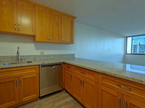 Walk to work, avoid the traffic! Renovated 1/1 with amazing city skyline views in convenient Kukui Plaza, Ewa Tower, located right in Downtown Honolulu. Newer vinyl plank flooring, kitchen and bathroom cabinets/counters, an open floor plan, lot of daytime lighting, and a window AC provide a very desirable living environment. Includes range, refrigerator, dishwasher, microwave hood, and ceiling fans. Laundry rooms are provided on each residential floor in the building, and there is 1 reserved parking stall. Water/Sewer is included. Tenant pays for electricity and cabinet/internet. Resident amenities include onsite staff, BBQ areas, swimming pool and a large community park and walking area. Renters insurance is required at move in, and no pets or smoking is allowed in unit.