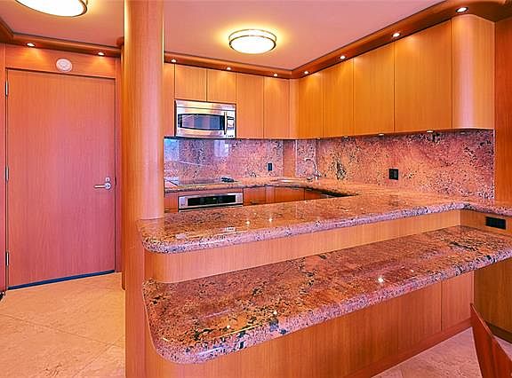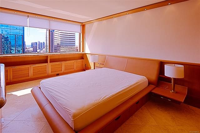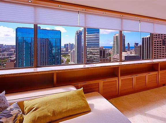 Enjoy a luxury furnished executive condo on 29th floor of Kukui Plaza in Downtown. Unit is fully renovated with polished teak wood paneling & marble, & high end leather & custom glass furnishings. Deep tub w/ jacuzzi in bathroom with updated toilet & designer faucets. Full kitchen w/ electric range/oven, microwave and dishwasher, & Sub Zero refrigerator. Granite counters & marble flooring. A unique centerpiece rotates a large TV to face living area or bed. Furnishings include a four seat glass table, queen size Tempurpedic bed with under bed storage drawers, safe, large sofa in neutral cloth. Amenities include private park with BBQ areas, swimming pool, ponds & waterfalls. Walking distance to Central Business District, Chinatown, dining & nightlife. Email mara@resllc.biz for showing.