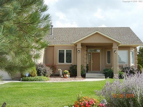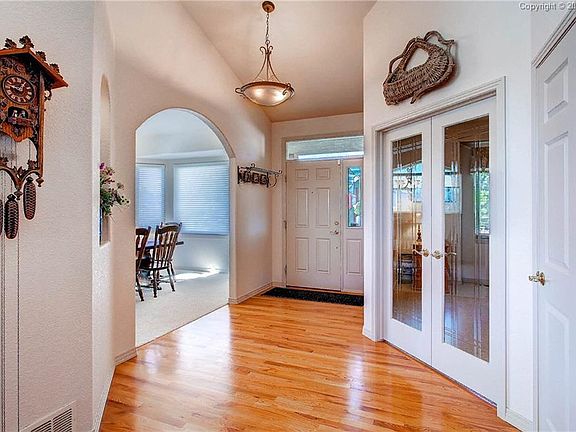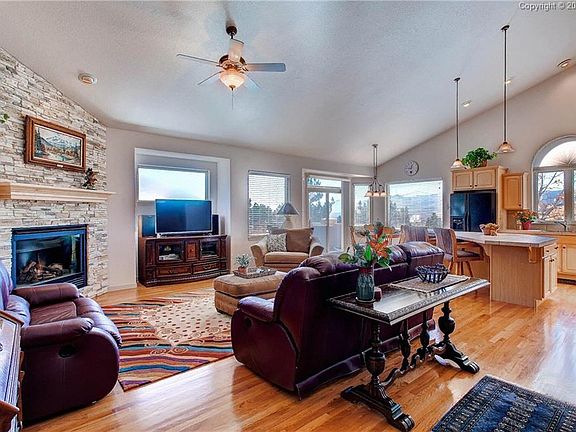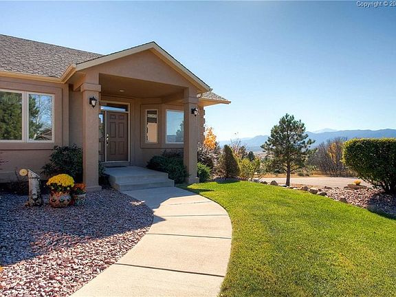 Beautiful ranch style home in Woodmoor with spectacular Pikes Peak and Front Range views. Hardwood entry with vaulted formal dining room that includes a bay window with mountain views plus an office with leaded glass French doors and a built-in bookcase. The vaulted gourmet kitchen features; center island with seating, hardwood floors, double oven, range cooktop, breakfast nook with walk-out to deck, perfect for entertaining. Home has very open floor plan with vaulted great room that includes stacked stone Fireplace, wood floors and plenty of windows to enjoy the views. Spacious main level master with sitting area and bay window, crown molding, five piece tiled bath with jetted tub and a glass block window for privacy. Completing the main level is an additional bedroom, full bath and laundry room. The bright and airy lower level features; guest bedroom suite with bath, two additional bedrooms with walk-in closets, full bath with double sinks and a utility area for storage, family room with fireplace and includes nooks and ledges, walk-out game area w/ wet bar & refrigerator. Meticulously maintained home in and out. Extras include; A/C, under stairs storage area, security system, beautifully landscaped w/ multiple outdoor living spaces to include a large low maintenance and private deck and a covered patio. A fantastic place to call home!