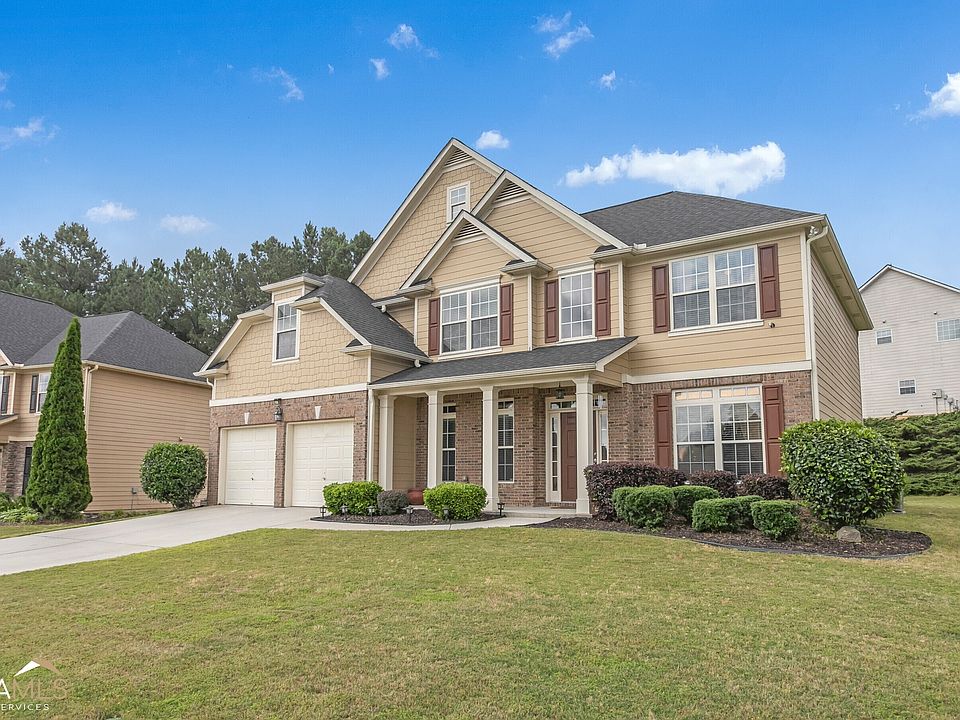 This craftsman-style home located in the Bramlett Station community offers an ensuite bedroom on the main level, providing convenience and privacy for guests or family members. As you enter the home, you are greeted by a stunning two-story foyer with arched entryways leading to the formal living room. The custom-built glass sliding doors in the living room add a touch of elegance and allow for an abundance of natural light. Adjacent to the living room, you'll find the formal dining room, which boasts tray ceilings, wainscoting, and laminate hardwood flooring that extends throughout the main level. This space is perfect for hosting dinner parties or enjoying meals with family and friends. The kitchen features stained cabinets, stainless steel appliances, and an island with a breakfast bar. The open concept design allows for a seamless flow between the kitchen and the two-story family room. With its floor-to-ceiling windows, the family room is bathed in natural light, creating a warm and inviting atmosphere. Double doors connect the family room to the attached Sunroom, providing an additional space for entertaining guests or simply relaxing. The primary suite on the upper level is oversized and includes a seating area. It boasts beautiful tray ceilings and a double vanity bathroom with a separate tub and shower. A large walk-in closet adds to the luxurious feel of the primary suite. The remaining three bedrooms on the second level also offer ample space, large closets, and plenty of natural light. Living in this home grants access to the amenities of a swim/tennis community, complete with sidewalks for leisurely strolls, conveniently located in the sought-after Archer High School district with easy access to schools, parks, and other amenities.