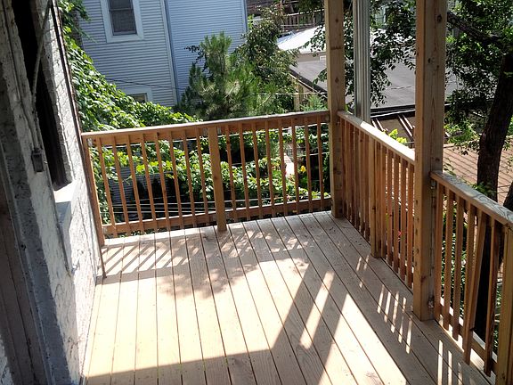 Extra-wide 3 bedroom in rehabbed 3 flat. Newer eat-in kitchen, black appliances, hardwood floors throughout, decorative fireplace, new bathroom, central AC and gas forced air heat, large sunroom off living room, formal dining room, large private deck, yard, laundry in building. Garage available for $100/mo. AVAILAB LE OCT. 1 Tenant pays heat and electric. Garage available for $100, no large dogs or aggressive breeds.