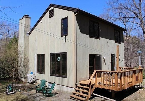 Sundrenched Contemporary home in excellent condition. First floor offers a spacious living room with cathedral ceilings, hdwd floors, fireplace and views. Large kitchen/dining room w/ huge windows and sliding doors to a 14x10 ft. deck and stone patio. Kitchen is newly remodeled with maple cabinets and quartz counter tops. There is a half bath, hall of closets and direct access to a 2 car garage. The second floor has 3 bedrooms and full bath. House is set back from the road nestled by Chapel Falls. Great location for hiking in the woods with trails to Pony Ledges while listening to the brook. Nature lovers will enjoy the organic vegetable garden, raspberries, blueberries, and other perennials. There is a sweet shack in the woods for writing, meditation and contemplation. 5 minutes to the charming village of Ashfield, 10 to Williamsburg and 20 to Northampton. Basement has copious amounts of storage and well insulated. Blown in insulation and mini-split create an energy efficient home!