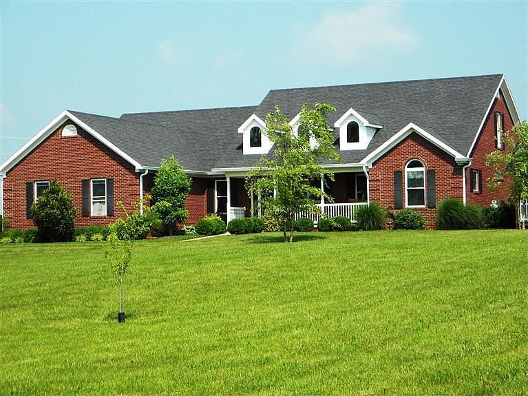 Country Living at It's Best! Gorgeous! 3 BR, 2 1/2 BA all brick ranch home on 5.3 beautiful acres in Scott County. Living room boasts masonry gas log fireplace, vaulted ceiling, and hardwood flooring. Large kitchen features Amish built cabinetry, kitchen bar, built in pantry. Master bedroom with double tray ceiling, master bath has double vanity, jacuzzi tub, separate shower, dressing table, his and hers closets and connects to large laundry room. Two additional bedrooms, full bath, 1/2 bath, and sunroom all on one level. Oversized garage 23.6 x 21.6. 16 x 16 patio and 12 x 24 gazebo. Storage shed, run in shed, and chicken coop. Property is fully fenced with approx. 3 acre paddock and Richie Watering system for livestock. Beautiful property with mature trees and lovely landscaping. Other amenities include central vac system, 89 gallon hot water heater, covered front porch. A must see!