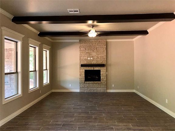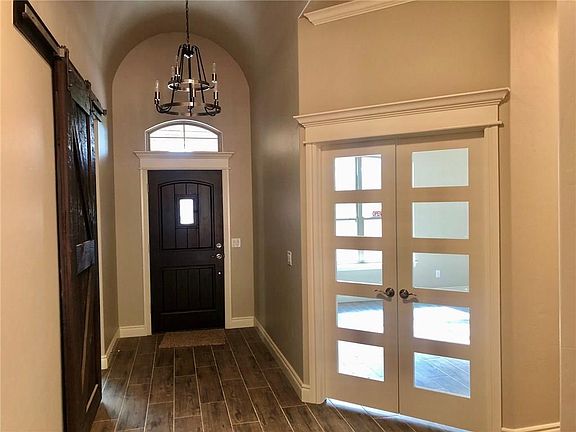 A little rustic feel with overheard stained beams and a custom made barn door and wood look tile. The open floor plan is beautifully adorned with stylish counter tops, stainless appliances, including a gas range,crown molding with arched door openings. both bathrooms have floating counters with under lighting. Master bath has a whirlpool tub and a separate shower that shows off a glass tile waterfall behind frame-less shower doors.Not only is there a lot of pretty, this house has practicability with great storage in the kitchen as well as throughout.Kitchen has a walkin pantry and pull out trash cans cabinets. Large covered back porch extending across the back of the house that ends with a wood burning fireplace. 4 car tandem garage has an overhead door facing the backyard. Easy to show easy to see!