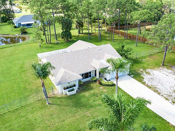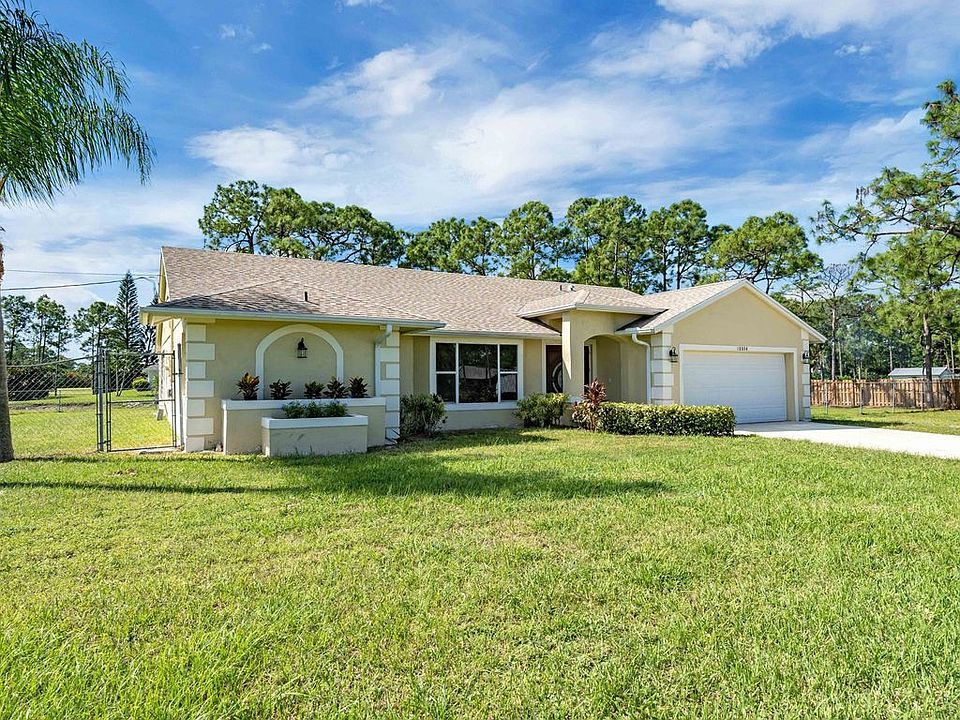 Beautifully remodeled 4/2/2 on 1.15 acres with NO POND! You will enter this updated home through the stunning mahogany wood, double front doors!This amazing home was completely updated in 2014, with a New roof, A/C system, dark wood flooring throughout, granite countertops, and stainless appliances. High-quality reverse osmosis water filtration system in kitchen. Soaring ceilings give this home a bright and open feel, great split floor plan, with the master on one side. Master suite has large bathroom w/double sinks and separate tub/shower.