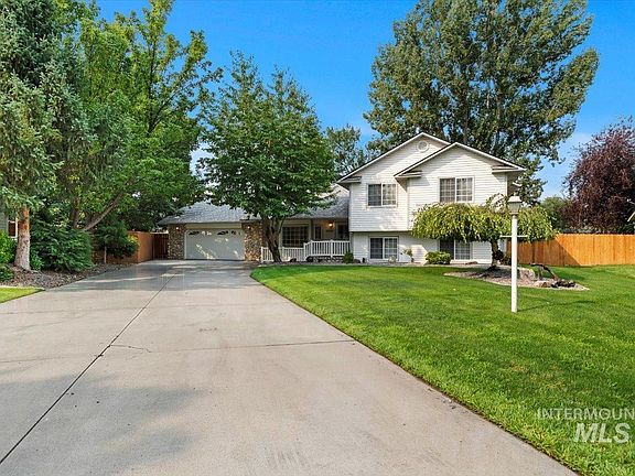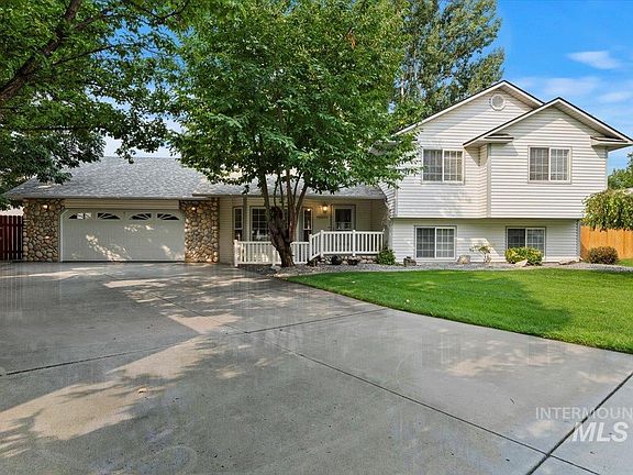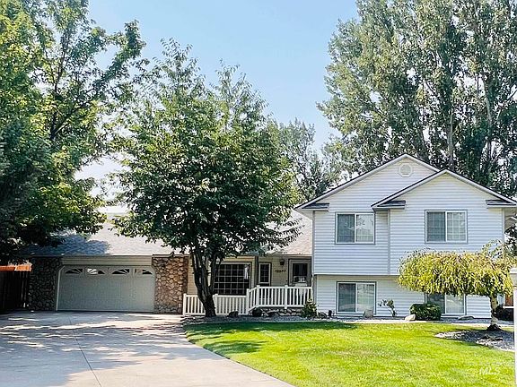 Tri level charmer with huge lot and room for everything. Close to everything NW Boise and Meridian have to offer ... the Village, restaurants and shopping with quick freeway access. 5 bedroom and 3 full baths with new carpet, paint throughout. Roof and HVAC serviced and in great shape. Daylight sunroom/ family room opens to back yard, two fireplaces and deep 3 car garage with additional outside cement parking and overhead door access to back yard. Water feature in back yard - mature trees and landscape in this quiet peaceful backyard. New fencing and landscape bark in back. Storage shed for all the yard tools and a waterfall feature on back patio. Quiet neighborhood close to the Village and freeway access.