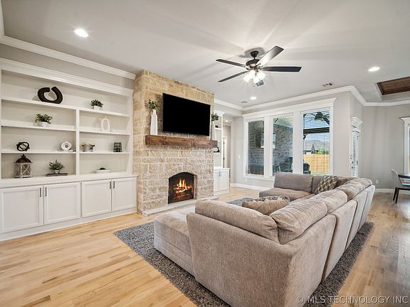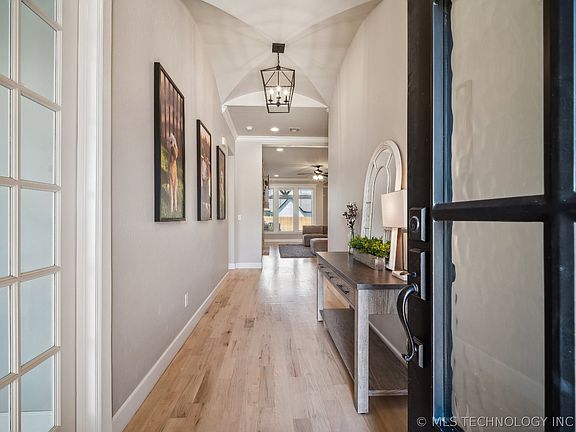 Transitional style single level home with abundance of natural light. Granite with spacious pantry, gas cooktop with pot filler, ample cabinet space. lovely wood floors, tankless H/W, split bedroom plan and safe room. Premium finishes thru-out, Master bedroom with vaulted ceilings. Private gated community with pool access, Bixby schools and a large covered patio for relaxing or entertaining. 3 full bathrooms, 4 bedrooms and a 3 car garage.