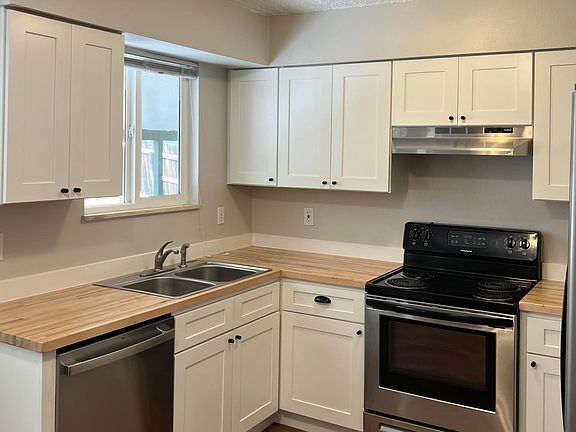 Great 4 bedroom home. Light and bright updated duplex rental in Golden close to everything. It has been updated top to bottom with solid surface flooring throughout, white kitchen cabinets, maple butcher block countertops, stainless steel appliances, bathroom vanities with granite tops and newer tub and tile surrounds. Nice sized windows let in lots of natural light. This rental has 4 good size bedrooms with larger closets and 2 full bathrooms that looks great. Plenty of living area with a large living space off the kitchen and on the lower level. Oversized one car garage with lots of room for tools, bikes, storage or whatever you need. Great front and back yards with mature trees. Back yard is fully fenced. Covered concrete patio in the back. Property is close to everything, easy access to I-70, 6th Ave and minutes away from Colorado Mills, Downtown Golden, and the School of Mines. Landlord pays water, tenant pays all other utilities. Owner pays Water, Tenant pays all other Utilities