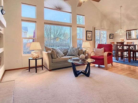 Beautiful main floor master suite with five-piece bathroom, high vaulted ceilings, tons of natural lighting, gleaming hardwood floors, gas fireplace, open eat-in kitchen with plenty of space, new appliances and blinds (two refrigerators included) great and easily maintained landscaping, steps away from private community pool and parks. Fresh paint, new carpet, new central air system with a one-year warranty, updated bathrooms and extremely well taken care of. Priced to sell so hurry in and don't miss your opportunity to own this updated house in a wonderful community.