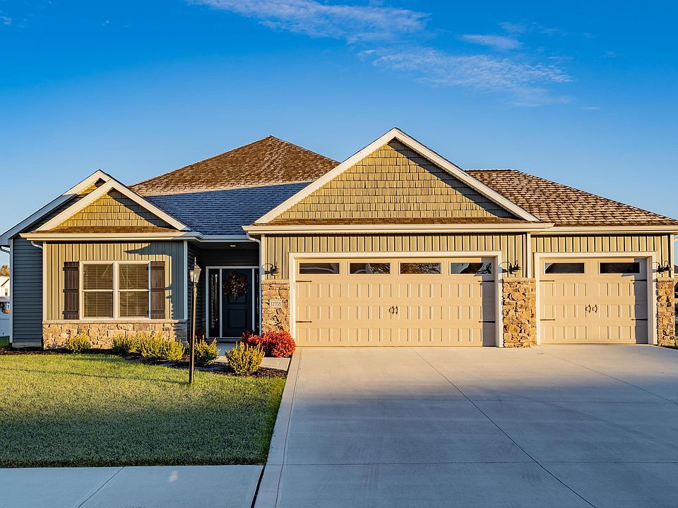 Beautiful, better than new custom built craftsman ranch w/ open concept split bedroom layout & large back covered patio in award winning SWAC school district! Located in desirable Palmira Lakes neighborhood just off W Hamilton Rd N, this immaculate 3 bedroom, 2 full bath home is completely move-in ready w/ lots to love! Completed in April 2021 by Heller Homes, it’s sure to charm from the moment you arrive to well manicured & spacious 0.3 acre lot. Gorgeous both inside & out, attractive exterior is inviting mix of timeless stone, shake & board & batten facade w/ attached 3 car garage. Step through front door w/ twin sidelights into clean & bright atmosphere complemented by upgraded luxury vinyl plank flooring, high quality craftsmanship & impressive 10’ ceilings starting in foyer w/ stylish chandelier through great room, kitchen & nook (9’ ceilings in rest of home). Main living area is big & welcoming allowing everyone to be together even while doing different things. Cozy family area centers around stone gas log fireplace w/ picture windows allowing plenty of natural light & view of back patio. Central island w/ bar overhang seating divides living from gourmet kitchen featuring abundant custom J&M Woodworking cabinets, soft close doors & drawers, oversized walk-in pantry, SS appliances, tile backsplash & quartz countertops. Excellent for entertaining, adjacent dining zone is roomy & nestled beside sliding glass doors to back patio. Split bedroom floorpan gives additional privacy w/ generous primary bedroom off kitchen boasting a luxurious en suite w/ tiled glass 5’ walk-in shower, double sink vanity & walk-in closet. Remaining 2 bedrooms are situated together by main full bath w/ tub/shower. Both are comfortably sized, each w/ walk-in closets & ample storage throughout. Sizable laundry off kitchen/garage entry w/ built-in shelves. Back patio is ideal for relaxing & unwinding after a long day w/ both covered & uncovered portions—there’s even an outdoor fan to help keep you cool & comfortable. Perfect for grilling & dining al fresco! Ceiling fans have also been added to all of the bedrooms, as well as custom blinds PLUS it is an energy efficient home. Newly established community is great for strolling w/ minimal through traffic & several ponds for ambiance. Conveniently located minutes from Illinois Rd w/ easy access to nearby shopping, dining & groceries including Chestnut Plaza & I-69. This one won't last long—reach out today!