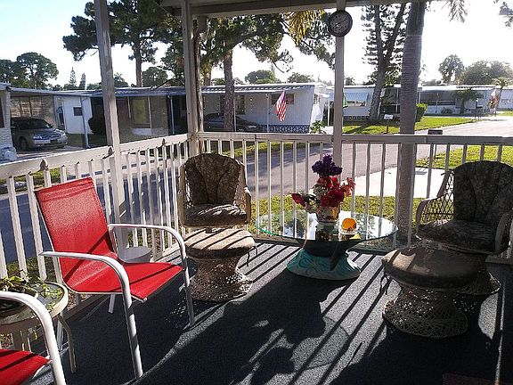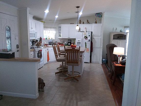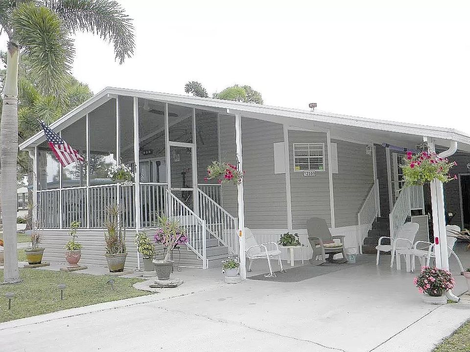 This newer, turn-key furnished home is located in a 55+ land-leased community on a corner lot. Home features an open-concept kitchen with island, dining area, living room and front lanai. Neutral colors (fresh paint) throughout and ready to move in! New washer/dryer, water heater, and air conditioner since we purchased in 2019. Home comes complete with furniture and fully equipped kitchen. Shed under the carport has a sink and includes tools. Lot has royal palm trees and bushes. 2012 GMC Acadia and golf cart with new batteries are available at additional cost.