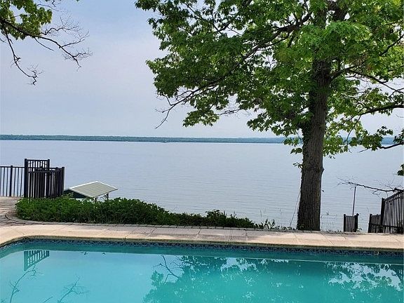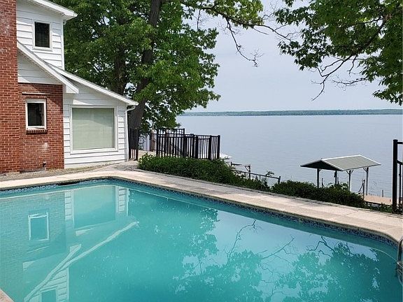 THE POOL IS OPEN!!! Come see this private resort on a cul-de-sac w/ 168 feet of lake frontage and a beautiful heated inground pool. This house has everything you want in a lake home and more! Over 3000 Sq Ft of living space with lots of windows, a living room with a gas fireplace, a music room big enough for grand piano, and a great room with access to the pool. The pool house addition adds a full bath and changing room. Lake side is a large master suite with big windows overlooking Seneca Lake. The kitchen has granite counters, reverse osmosis water system and gas range. Outside space includes a two level deck, a new dock with electric hoist, a Generac hardwired generator system, a car port, a de-attached garage, roadside parking and access to green space across the road for games. Travel through this quiet neighborhood on foot or bike to the nearby village to find a playground and to play tennis and pickleball.