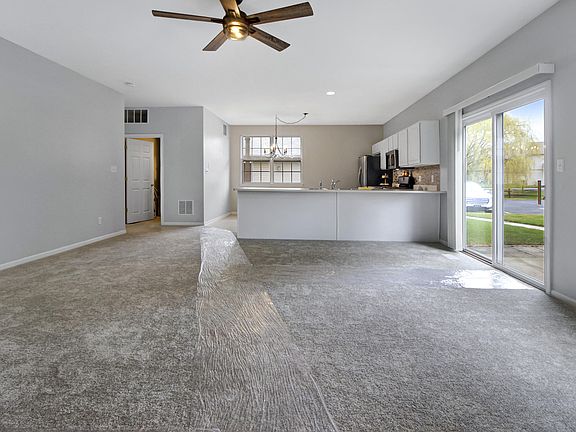 Freshly painted with brand new carpet throughout. This MAIN level condo is move in ready. Open concept with spacious kitchen peninsula, all appliances including NEW microwave and dishwasher. , Good size storage room. Detached garage only steps from unit with a nice pond view.