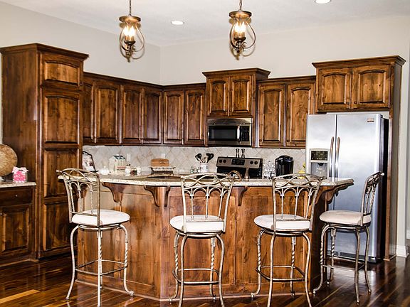 Must see! Hard to find TRUE RANCH at this price point! Charming Old World Style home with custom touches throughout. Spacious open floor plan with vaulted ceilings & walnut flooring.Two story row of windows overlooks covered patio. Kitchen w/ granite counters, lg pantry, huge island & ss appl. Cozy Master Suite with dr to patio, sitting area & spa like bath. Two additional bedrooms on main level. Massive lower level stubbed for bath. Barely lived in! Tucked back in neighborhood on cul-de-sac lot. Close to 50 Hwy.