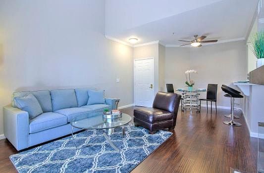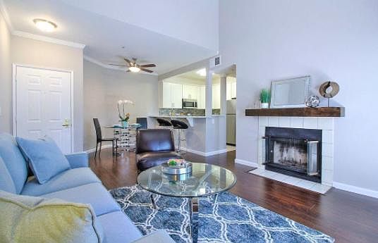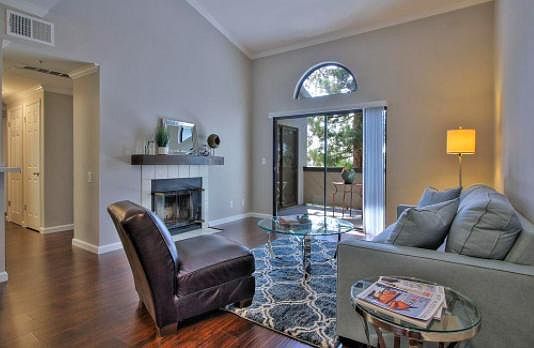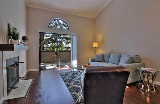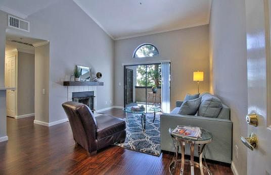 Lovely community nestled among trees in a delightful neighborhood. Bright and airy open floor plan on the top floor featuring volume ceilings and hardwood floors. Kitchen and both bathrooms recently remodeled with new cabinetry, counters, fixtures and stainless steel appliances. Two assigned parking spaces. Community offers swimming pool, hot tub and clubhouse. Water and garbage covered by owner in HOA fee. Tenant pays for electricity/gas.