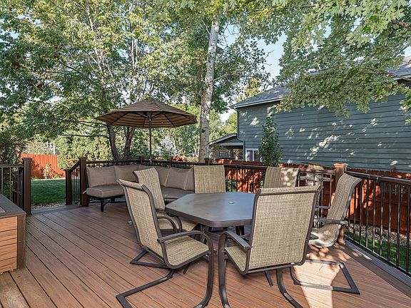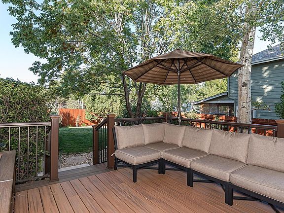 Easy access to parks, open space, trails! Clubhouse, pool, tennis, racquetball+basketball! Corner cul-de-sac w/fabulous outdoor living! Over-sized shaded Trex deck w/table, chairs, sofa+ cushions, umbrella+storage! Relax/entertain overlooking lrg flat yard! Rare 3 car garage= workbench, cabs, extra lighting, insulated doors. Bright, cheery sun-filled rooms! Great room w/soaring ceilings, lots of windows+gas fireplace graced w/stone, wood mantel+decorator niches. Arched openings to dining rm. Flr to ceiling windows/doors open to outdoor oasis. Kitch appl. incl, island/breakfast bar lit w/new pendant lights. Generous vaulted master suite, walk-in closet+att remod bath loaded w/quartz, tile+skylight. 2 add'l beds share full bath w/dual sinks, tile flr, coffered ceilings. Complete basement to your liking! Cabs, wash/dry incl. White baseboards/trim+six panel doors, nickel hardware, updated light fixtures, humidifier. Newer water heater/furn/AC, impact resist roof, ext paint, trim, gutters.