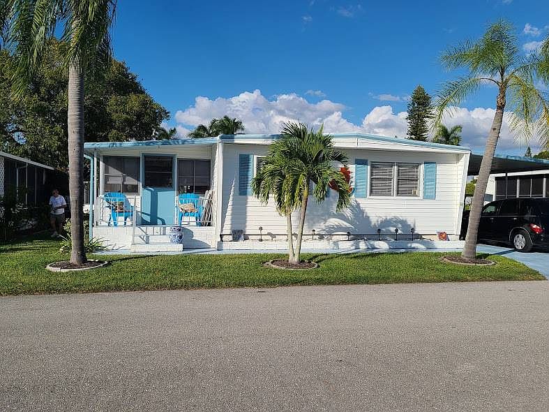 1972 PKWO - HS Beautiful 2/2 Doublewide home, 55+ Gated community, close to Sanibel and Ft. Myers Beach, FL - $72,000 furnished. You will enjoy your time in paradise, this beautiful 2 bedroom/2 bath home, with a total of 1,392 sq. ft of living space, located in the desirable Tropicana RV Resort, a 55+ Gated Community, minutes away from Sanibel and Fort Myers Beach, shopping, dining and entertainment just around the corner; attractions and so much more! Friendly community, with lots of fun activities during season, Tropicana's amenities make this community a great place to call home. Lot rent is $673.72 includes lawn maintenance, trash pickup, taxes and use of the amenities. Enjoy two heated pools, shuffleboard, horseshoe, billiards, fitness classes, activities Clubhouse, Library, Pet Friendly. Organized group excursions and outings, Golf courses and Tennis nearby. This 2 Bedroom/2 bath home offers laminate flooring in living room, dining room and bedrooms; tiled floors in the kitchen and bathrooms. Lanai was converted adding additional sq. ft under air, and it can be used as another bedroom, game room or office area; full size washer and dryer, screened patio with a storage shed. New plumbing and water heater in 2019, Central A/C installed in 2018, fresh paint in the kitchen and living, roof recoated just recently. Turn-key furnished, ready to move in, all you will need is your clothes and toothbrush! $72,000 priced to sell, this home will not last long, call today to schedule a private showing.