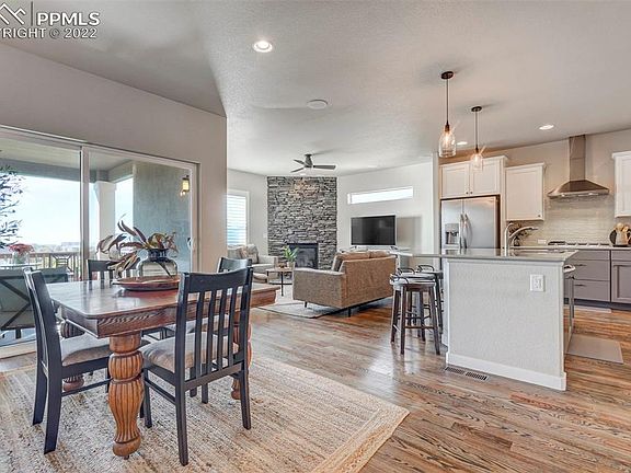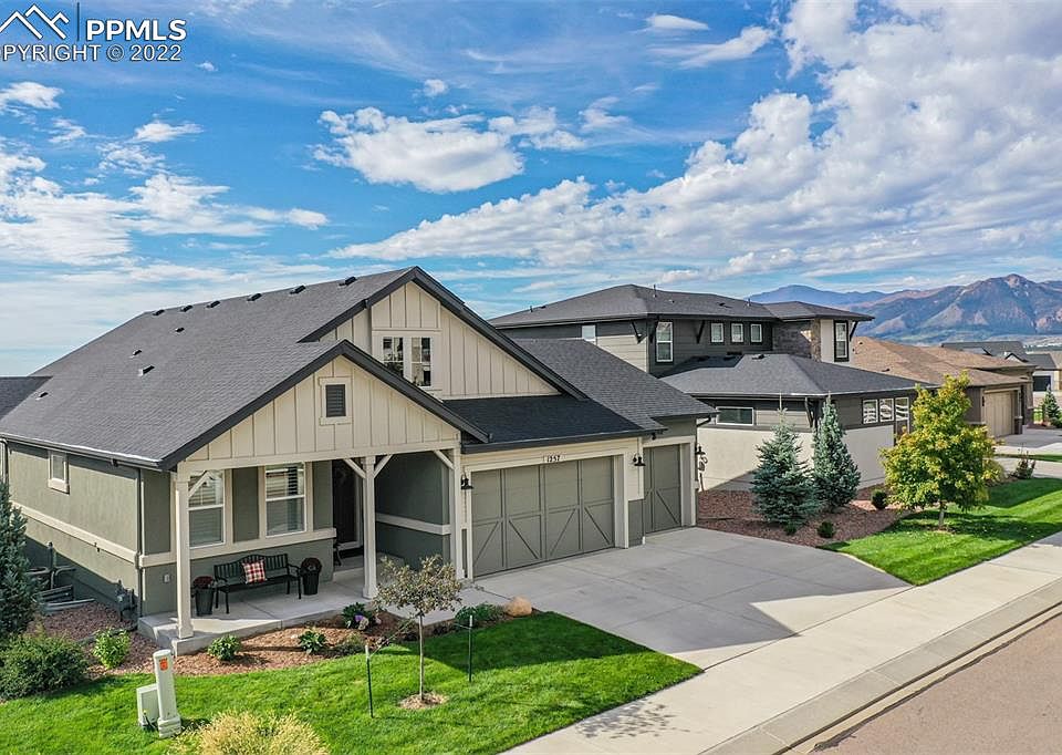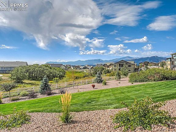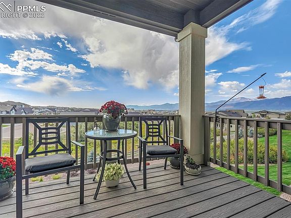 Like new Vantage built desirable Derby floorplan. Low maintenance ranch home backs to open space offering incredible panoramic views of the mountains & city lights. Striking the perfect blend of comfort & modern living. Nestled in The Farm neighborhood. Walk to nearby park w/ biking/hiking trails & community center w/pool & paddle boarding. Easy access to USAFA, schools, shopping & the city’s newest amenities. As you enter the landing opens to solid hardwood floors that flow throughout the main level. Inviting you into the light & bright great room. Featuring gas fireplace w/floor to ceiling stacked stone surround, built-in speakers, 9’ceilings & wall of windows letting the natural light pour in. The nearby dining area can accommodate large tables & walk-out access to covered deck. The composite deck offers a private area to relax & enjoy the unobstructed Pikes Peak views. The natural light continues in the gourmet kitchen. Enjoy expansive quartz island w/storage & breakfast bar, SS appliances, walk-in pantry, wall-mounted oven/microwave, gas range top, upgraded metal hardware, & subway tile backsplash. Main level primary suite is loaded w/amenities & boasts mountain views, bay window, textured carpet, 5pc bath w/double vanities, tile floor, oversized shower, soaking tub & separate commode. Additional main level bedroom/office has nearby access to full bath w/tile floor & quartz vanity. Wrought iron railing leads you downstairs to the finished walk-out lower level offering an open family rm w/ 9’ ceilings, pre-wired for theatre surround sound, & wall of south facing windows letting in the natural light. 2 lower-level bedrooms have easy access to nearby ¾ bath w/tile shower surround. Unfinished 5th bedroom could be private guest area w/ ensuite bath or large storage room. Bonus items incl; Central AC, oversized 3 car tandem garage, laundry room has designer tile floor w/sink & cabinets, HOA maintained landscaping, cul-de-sac street & many more!