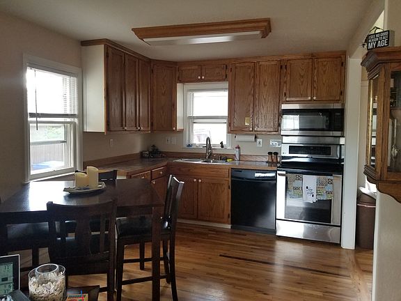 Check out the kitchen with appliances that were newly purchased this year. Tall oak cabinets and hardwood floors give this home a warm and homey feel. The hardwood floors were refinished in March of this year and the interior was repainted then, too!