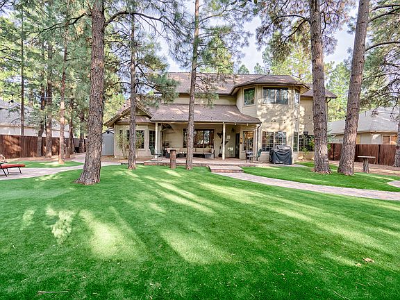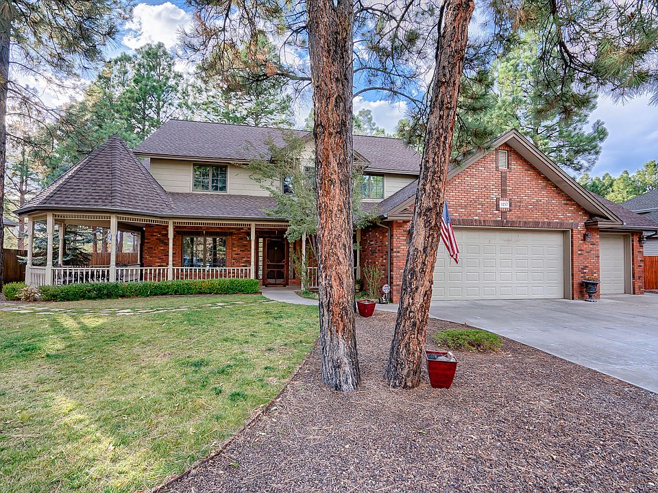Beautiful home in Amberwood, one of Flagstaff's finest family neighborhoods. Enjoy the wrap around front porch on this quiet secluded street with forest access minutes away. The custom-built home features 4 bedrooms (one suite is on the main level), 3.5 baths, large family room with fireplace and living room.. The master bedroom/bath is upstairs with a large walk-in closet, fireplace and sitting room. The large open gourmet kitchen boasts a large kitchen island, kitchen dining area, adjacent to a large family room with built-in custom shelves and cabinets, fireplace. Brazilian Cherry hardwood floors are in the entry way, powder room, kitchen and kitchen dining area. Beautifully fully fenced backyard with stone walkways, forever green lawn and patio. 3 car garage. Central air.
