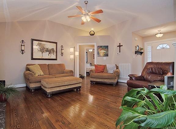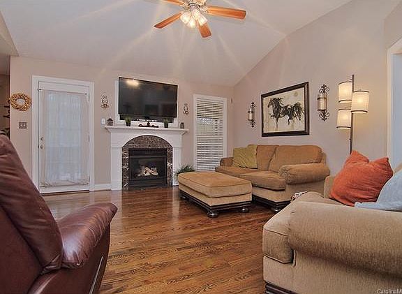 Adorable, split RANCH floor plan with real HARDWOODS, STAINLESS appliances, VAULTED ceilings and SCREENED PORCH. The backyard is LARGE and sloping but has been tiered for ample, flat space. Home has entryway, family room with FIREPLACE, and a beautiful kitchen with LARGE eat-in area. TILED bathrooms and plenty of entertaining space. NO HOA!! Utilized finished garage or convert back to 2-car attached garage. Lovely Concord neighborhood and Mt Pleasant schools.