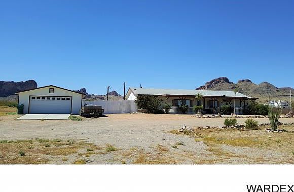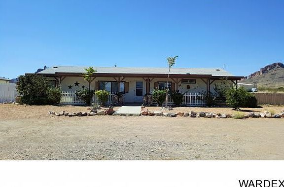 Warm and inviting immaculate kept home and property located close to the foothills of the Black Mountains with breathtaking panoramic views. This 4BR, 2BA, 1,680 sq. ft. MH sits on 2.21 acres and has a 2 car detached garage. Interior of home features a split floor plan, comfortable sized guest bedrooms with nice closet space, big master bedroom with walk in closet, roomy master bath featuring double sinks. Light and bright kitchen with breakfast bar, plenty of counter and cabinet space, pantry and opens to family room with wood burning stove and casual dining area, large living room, vaulted ceilings, ceiling fans, carpet and bamboo wood flooring through out. Enjoy sitting and entertaining on the front covered patio or watching the sunset over the Black Mountains and stargazing on the rear patio area. Chain link fenced rear yard, landscaped front yard, plenty of room for horses, livestock, gardening and toys. Easy access and only 20 minutes to Kingman or to the fun of Laughlin, NV., the Colorado River and Lake Mohave. If your looking for a peaceful lifestyle in a great location this is the place for you.