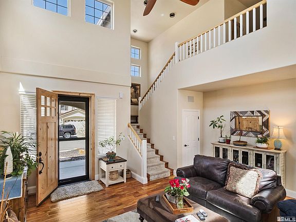 Beautifully updated property located minutes from downtown Carson City and a hop on the freeway to Reno! Tastefully updated home includes towering great room ceilings that opens to the custom kitchen featuring Knotty Alder cabinets and leathered granite countertops. Engineered hardwood floors throughout. Back yard features covered patio, bar, gazebo, gas firepit and fountain. A truly stunning property!, Upgrades/updates include: Alder front door, Alder French doors, Custom fireplace with built in entertainment center, Engineered hardwood floors, new carpet, Alder kitchen cabinets, black stainless steel appliances, leathered granite countertops, custom kitchen island, remodeled bathrooms, light fixtures, Gazebo in back yard, natural gas fire pit, fountain in backyard. Clock, TV and speakers in great room included in sale!