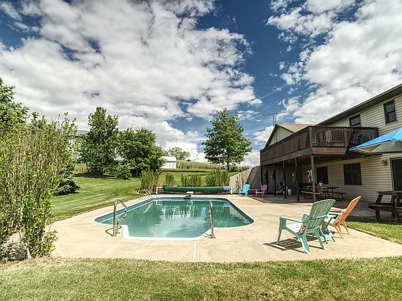 Welcome to this spacious home with a scenic, peaceful setting on 6.76 acres, including a dream outdoor space for grilling, pool parties, gardening ,ATV riding...the options are endless! Step inside to almost 3000 sq ft of finished living space. The open-concept main level features a bright, airy living room with fireplace, dining area with french doors leading to the deck & a functional kitchen layout with island making it ideal for family gatherings. Head down the hall to 2 bedrooms & guest bath and a primary suite with walk-in closet, double vanity & walk-in tiled shower(2020). The finished basement has a game room with pool table, bar/kitchen area, large family room w/ french doors leading out to the pool, a 4th bedroom with 3/4 bath, plus heated basement floors(new boiler 2020). If the 3-car attached garage isn't enough space, check out the 50x88 building w/ limestone floors, electric & water! There's chicken coops & fenced in corral & pasture perfect for your horses or cows. Top all this with a whole house generator, exterior gas hookups on deck & lower patio, metal roof (2024), Well pump(2020),water heater(2021), main area LVP flooring(2022), & bedrooms wood laminate(2020). Listing agent related to one seller.