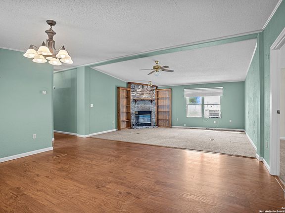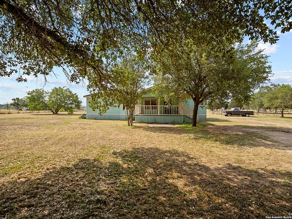Set on 2.36 acres in Schertz, this property offers space, shade, and convenience-just minutes from Randolph Air Force Base and excellent shopping and dining options. The 3-bedroom, 2-bathroom home features a large front porch, an open living and dining area, and a kitchen with ample cabinet storage. Ceiling fans are installed throughout for added comfort. The primary bathroom includes a double vanity, separate shower, and tub. Outdoors, the property is dotted with mature trees and includes a shed for extra storage or workspace. This property offers room to spread out with easy access to city amenities-ready for your ideas and updates.