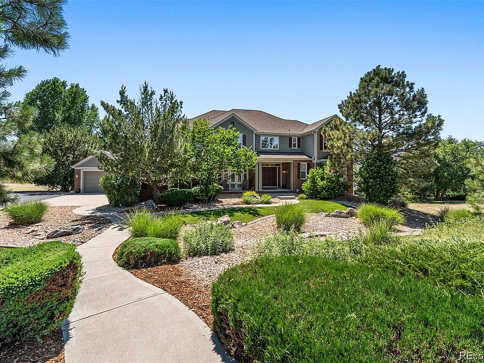 Discover the epitome of luxury country living with close to town benefits in this elegant executive residence! Classic floor plan featuring an entry foyer, large home office, parlor room, formal dining room, and a huge family room with fireplace. The chef's kitchen is generously appointed with expansive cabinets and counter space, perfect for large gatherings, and includes a double oven, paneled fridge, gas range, and a huge kitchen island. A cozy breakfast nook next to the double sided fireplace completes the kitchen, and you will love both the glass doored pantry and the butler's pantry adjacent to the dining room. The main level is completed by a recently updated laundry room + mud room. Venturing upstairs you will find a sitting loft next to the enormous master suite with private retreat. The large master bedroom has its own fireplace, and the 5-piece master bath adjoins an impressive walk-in closet with custom built-ins, including a center island with storage drawers. Wow! 2 additional upstairs bedrooms are connected by a jack-and-jill bath, while the fourth upstairs bedroom has its own en-suite full bath. The fully finished garden level basement is perfect for fun or relaxation. Filled with light, you are greeted by a large TV/game area, a billiard table with ping-pong topper (included), and another gaming area (air hockey!). Additionally, you will find two more bedrooms, a remodeled bathroom with steam shower, and a convenient play room or exercise room. Wired speakers enhance your media experience, and the wet bar is equipped for effortless party hosting! Outside, the covered trex deck offers views of the mountains and Pike's Peak, while mature trees provide plenty of privacy for enjoying your hot tub under the stars! An attached 3-car garage + a detached 4th car / toy garage is great for any number of uses (man-cave, office, storage). All this on a full acre of serene property in highly coveted Robinson Ranch! Enjoy Parker's top rated schools, parks, more!
