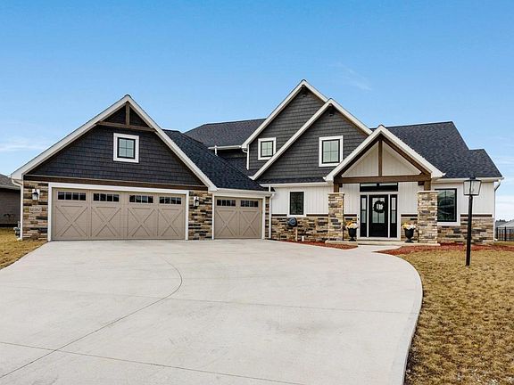 Welcome to this exquisite luxury home built by Bob Buescher Homes, where elegance and comfort meet breathtaking views. Bathed in natural light, the open-concept with cathedral ceilings creates a seamless flow, highlighting the stunning DOUBLE pond view from the oversized covered back porch. The spacious living room features a floor to ceiling stone fireplace and electric blinds. The gourmet kitchen is a chef's dream, complete with sleek black stainless appliances, a large island with quartz countertops, and a huge walk-in pantry for all your storage needs. The main floor is home to the luxurious master suite, offering a peaceful retreat with its private en suite bathroom complete with a huge custom tile shower and double vanity, providing the perfect escape after a long day. You will also find the den/home office space on the main floor along with a half bath. Upstairs, is a large versatile loft area that can be used as a second living space. Three generously sized bedrooms, two full bathrooms, a second office or work out room, and a walk-in attic complete the upper level. This home also includes a three-car garage (almost 1000 sq ft) with epoxy coated floors, providing ample space for vehicles and storage. Built with high end finishes including Pella Triple Pane windows and attention to every detail, this property combines modern luxury and functionality for the ultimate living experience. Don't miss the chance to make this dream home yours!