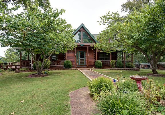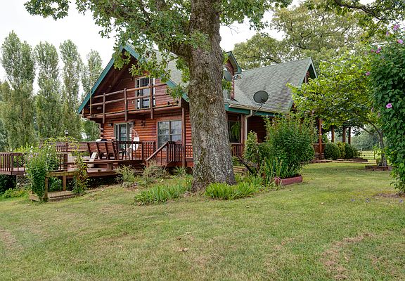 Custom built full 8'' log home with several porches/decks, covered front porch, all this looks out at 13 acres+/- open panoramic views. Tiered gardens,mature landscaping, several outbuildings, one could be a bunk house. No restrictions. Home is well planned with every inch accounted for. Handicap accessible, and separate entrance to in-law quarters on lower level. 2nd floor loft overlooks dramatic wood/log features of home. There is a bath and bedroom on each floor. Several built-in bookcases, storage units. Custom oak cabinetry, abundant storage, bay window, pull out cabinet drawers, jetted tub, solid wood panel doors are some of the features. Fireplace is a focal point as you enter the home to the second floor with slate hearth. Brahma steer could stay. Furnishings can be purchased.