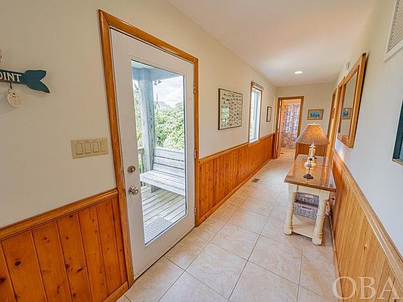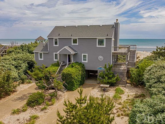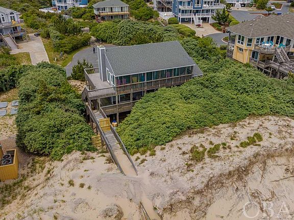 This 5 bedroom 3 bath "fisherman's" cottage sits on one of the most protective dunes in Ocean Hill or Villages at Ocean Hill. Stabilized with sturdy Russian Olives providing extra shelter from high winds and nor'easters. One, of only two homeowners, who have lovingly maintained this charming reverse floor plan. Offering an open concept, with stunning ocean views, and easy to clean ceramic tile throughout. The top-level boasts vaulted ceiling, juniper accents, a newer gas fireplace (2017), a large kitchen, dining area and huge primary bedroom with an ensuite bath. The great room has an abundance of windows providing lots of natural light and impressive views of the Currituck Lighthouse and the Ocean. The chef's kitchen includes ample counter space and cabinet storage, smooth-top range/oven, refrigerator, and a beverage fridge. Just off the great room is a wrap around porch, 3 sliders to an outstanding screen porch offering plenty of shade in the middle of the hot summer, and stairs to the mid and ground level. The spacious primary bedroom has an amazing view of the 4 wheel drive area to the north, and the ocean. There's also a private bath and private access to the screen porch. The mid-level has 4 more bedrooms, also with a private access to the covered deck, and 2 full baths. The exterior features low maintenance Hardiplank siding, a large owner's storage closet, outdoor shower, and an outdoor utility room. There's also a private walkway to the beach that sellers do not use. A buyer will need to add stairs should they choose. There's an estimate on file from Emanuelson and Dad. Home sits high and is an X-Flood Zone-no flood insurance required. The community beach access is three doors to the south, and should a buyer choose to join Villages at Ocean Hill amenities their oceanfront pool is just a short walk to the the north. Recent Upgrades include Simonton Windows installed in 2017, all polybutalene plumbing replaced, septic replaced in 2002, and more. Please see associated docs for the complete list. Ocean Hill is quiet and away from the hustle and bustle of tourist traffic. It's one of Corolla’s last paved communities before the 4×4 beach area. Buyers can join the Villages at Ocean Hill amenities (fee based) which include two community pools (oceanfront and lakefront), tennis courts, basketball courts, playground, fitness center and a 10 acre lake for fishing. This home is a perfect primary, secondary, or rental. Please see projection on file.