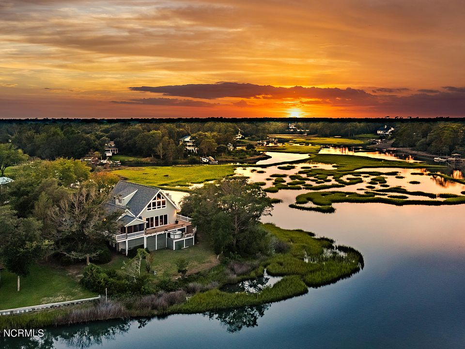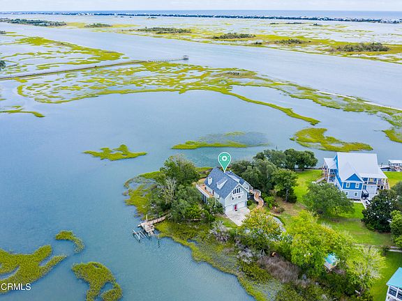 Spectacular views across the Intracoastal Water Way all the way to Topsail Island, along with a deep water access canal await the new owner of this beautiful property. Decks on three sides of the home, a screened porch, a hot tub deck and a balcony off the back upstairs suite afford views in every direction. Even inside the home, the views are central in the open floor plan with vaulted ceilings with windows and glass doors across the back, plus views from the loft. A stone fireplace and hardwood flooring, including some knotted pine, make the space warm. The kitchen was updated in the past, and includes granite countertops and a generous amount of cabinet space. Two bedrooms on the main floor share a full bath. The upstairs space includes a pine floor loft, a large closet and a bedroom with ensuite bath. This space could be updated to create a wonderful primary suite, and it includes a balcony with canal and marsh views. The 2-bay garage is the base level of the home and includes a separate, wired workshop space. Enjoy boating to dinner or the beach or one of the beautiful inlets that seem like your own island paradise.