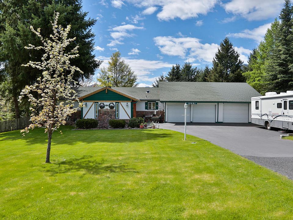 Great Ski Hill home with beautiful views and expansive fenced yard. This home offers 3 Bedrooms, 2 Baths, Master on Main floor and 3 separate living areas for gathering or entertaining. The 3 car garage offers extra room for recreational toys and the paved driveway is set up for motorhome parking. Updated kitchen, wood doors, lots of natural light for both upstairs and the daylight basement. North side patio area gives shade for outdoor enjoyment. This home is on the Ski Hill Domestic Water system and also offers a fully irrigated lawn with 5 zones in the back yard. Mature trees and landscaping, room to garden, playhouse included.
