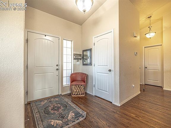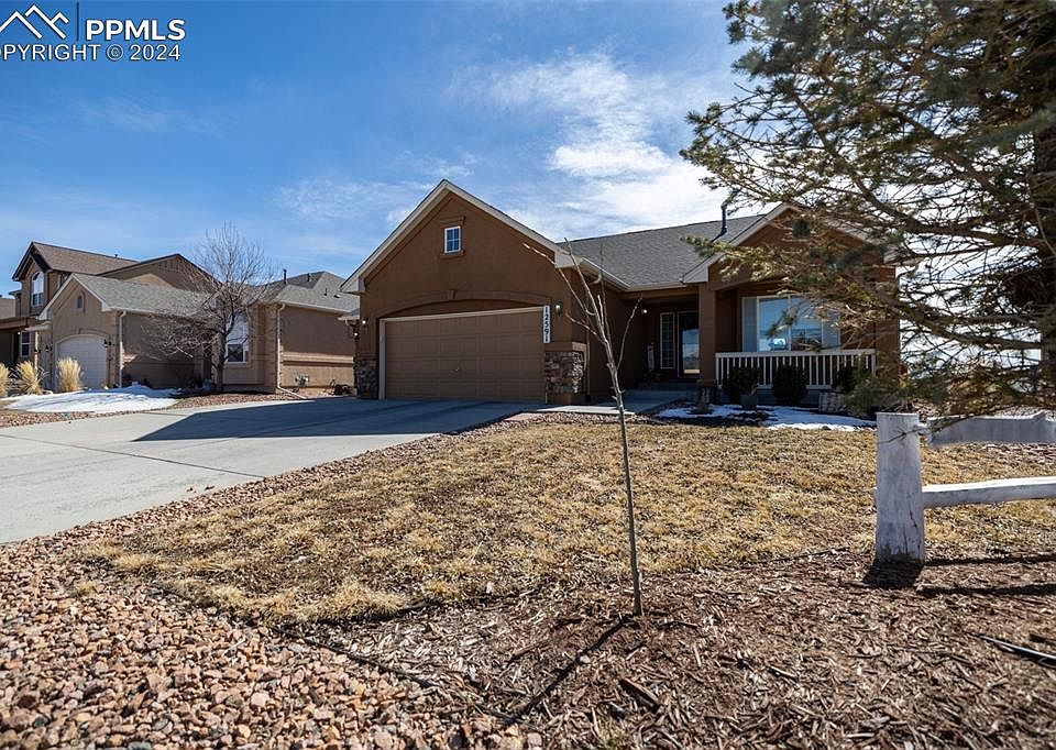 Nestled in the serene community of Meridian Ranch, this exquisite 4-bed, 3-bath ranch-style home boasts breathtaking mountain views that will captivate you from the comfort of your living room and backyard. Wake up each morning to majestic peaks greeting you and unwind in the evening against a backdrop of unparalleled natural beauty. This residence is more than just a home; it's a lifestyle that marries comfort with elegance. The heart of this home features hardwood floors in the main living area, adding warmth and luxury to the space. The open-concept kitchen, designed with entertaining in mind, serves as the perfect gathering spot for friends and family. Coupled with the main living and laundry facilities conveniently located on the main level, this home exemplifies practicality and ease. Additionally, a cozy fireplace in the living area provides the perfect nook to snuggle up and stay warm during the winter months. Car enthusiasts, gym buffs, or families will be particularly drawn to the spacious 3-car garage, the third garage is currently being used as a separate kids' play area divided from the main garage by a wall and door for added safety. Situated in a vibrant neighborhood, residents enjoy access to top-notch amenities, including the Antler Creek Golf Course — a haven for golf enthusiasts. The Community Recreation Center offers pools, fitness and leisure activities, ensuring there’s always something for everyone. With 500 acres of parks, trails, and open space at your doorstep, outdoor adventures are just a step away. The convenience of community shopping, schools, dining and other options makes everyday errands a breeze. If mountain views are your thing, this house will not disappoint, has unobstructed views of the entire mountain range for you to stare at everyday!