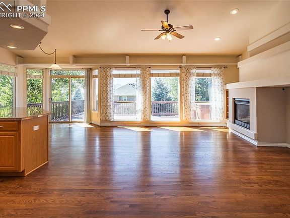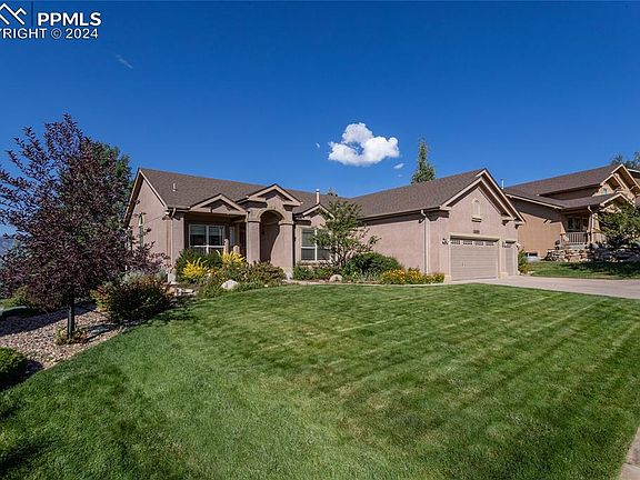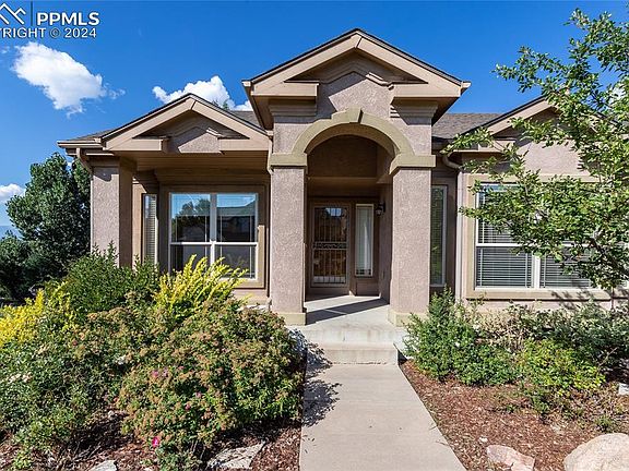 Welcome to your dream home with breathtaking Pikes Peak views! This exquisite 4-bedroom, 3-bathroom ranch-style residence combines comfort and luxury in a prime location. As you enter, you're greeted by a welcoming foyer leading to the heart of the home: a spacious living room with vaulted ceilings, hardwood floors, and a cozy fireplace—perfect for both relaxing and entertaining. Adjacent to the living room, you'll find a chef’s delight in the eat-in kitchen, which boasts hardwood floors, stainless steel appliances, an island, and vaulted ceilings. Step outside from the kitchen to the expansive deck, where you can unwind in the hot tub while taking in the spectacular Pikes Peak views. The dining room features a stunning coffered ceiling, enhancing the elegant atmosphere. Nearby, the office with double doors offers a flexible space that could also serve as an additional bedroom. The main level also includes a cozy bedroom, a convenient laundry room with a washer and dryer, and, of course, the luxurious master suite. This retreat boasts a double door entry, a private walkout to the deck, and a charming fireplace. The attached bath includes a double vanity, a walk-in closet, and a lavish shower with multiple heads. Descend to the basement, where you’ll discover versatile living spaces: two additional bedrooms, a bonus room, a 3/4 bath, and a large family room featuring a wet bar, fireplace, and built-ins. The basement also offers a walkout and two additional storage areas. Additional features of this remarkable property include a sprinkler system, central air, and a spacious 3-car garage. Experience the perfect blend of elegance, functionality, and stunning views in this extraordinary home!